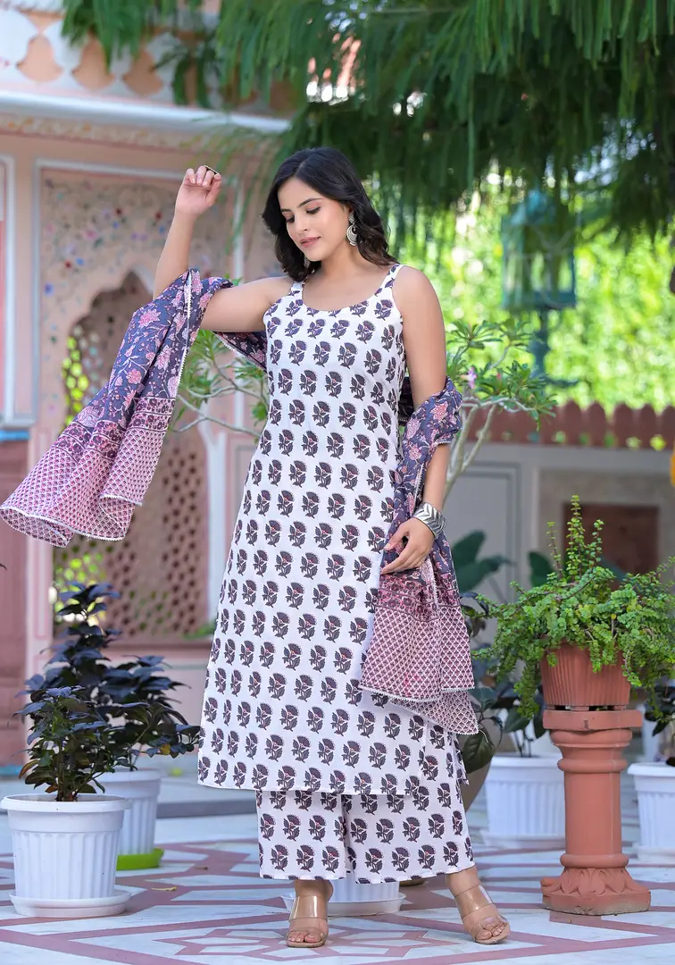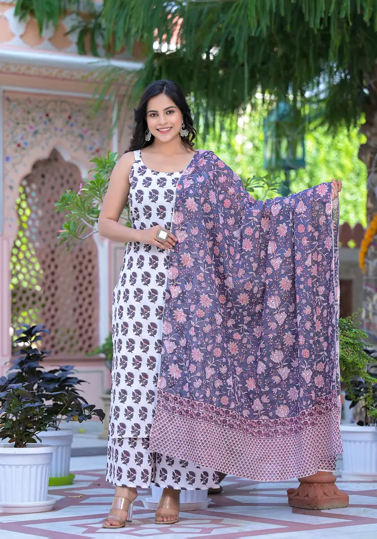 Attractive White Viscose Rayon Kurta Palazzo With Dupatta Set For Women