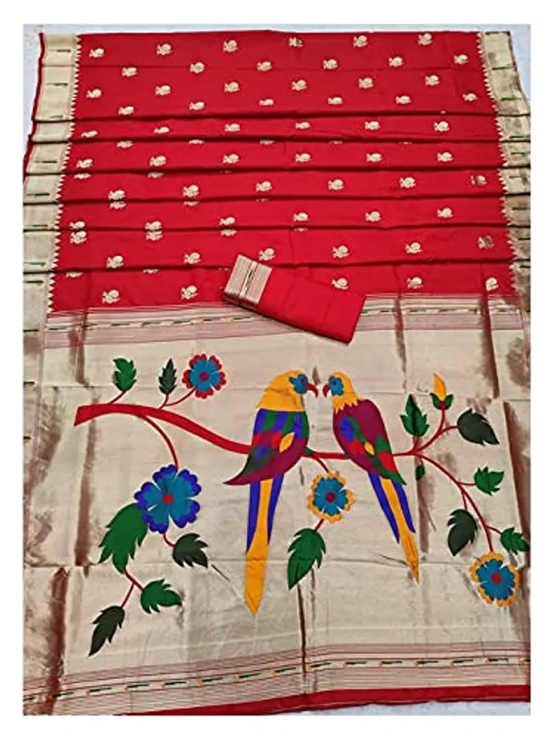 Pandadi Saree Women's Paithani Silk Saree With Blouse Piece - Red