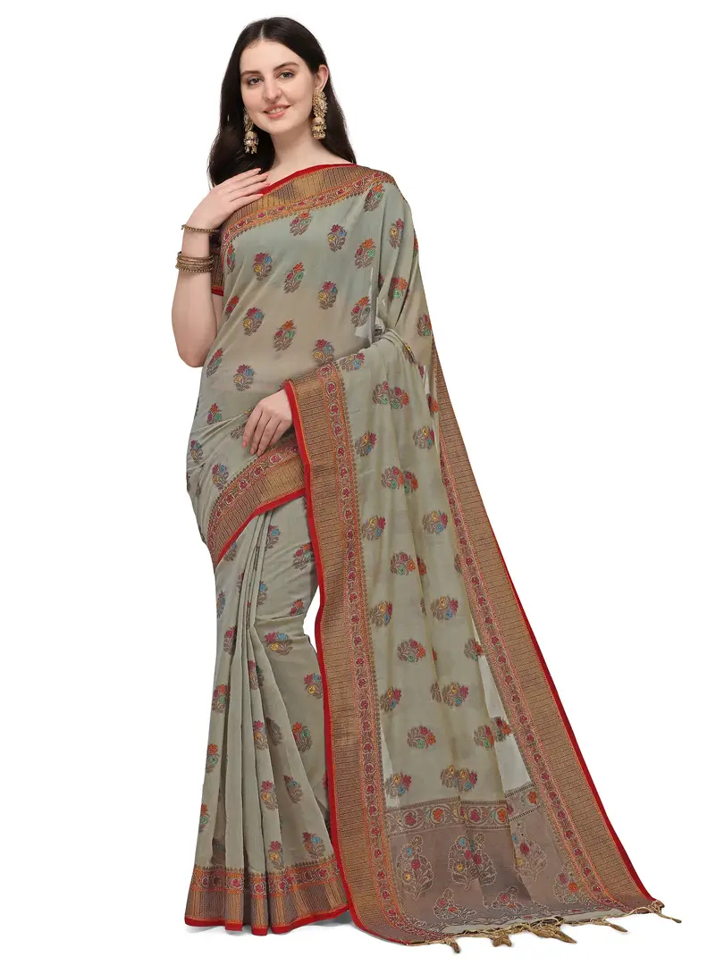 Party Wear Grey Colour Woven Silk Embelished Work Festival Saree