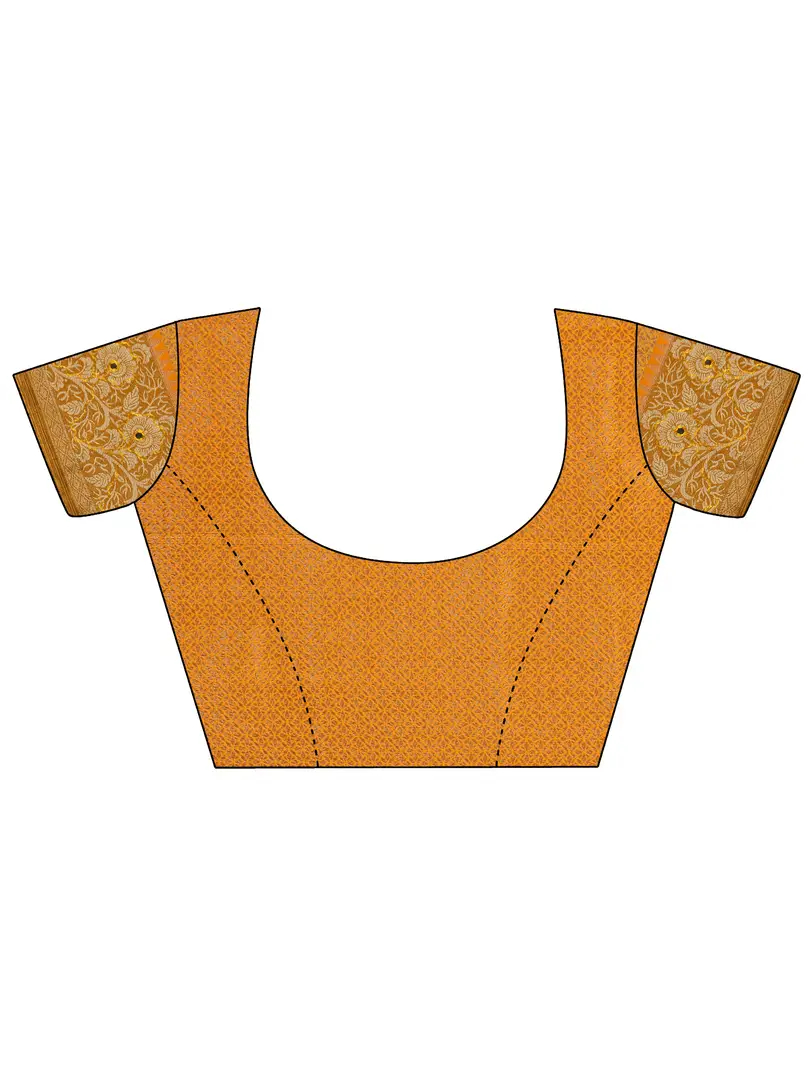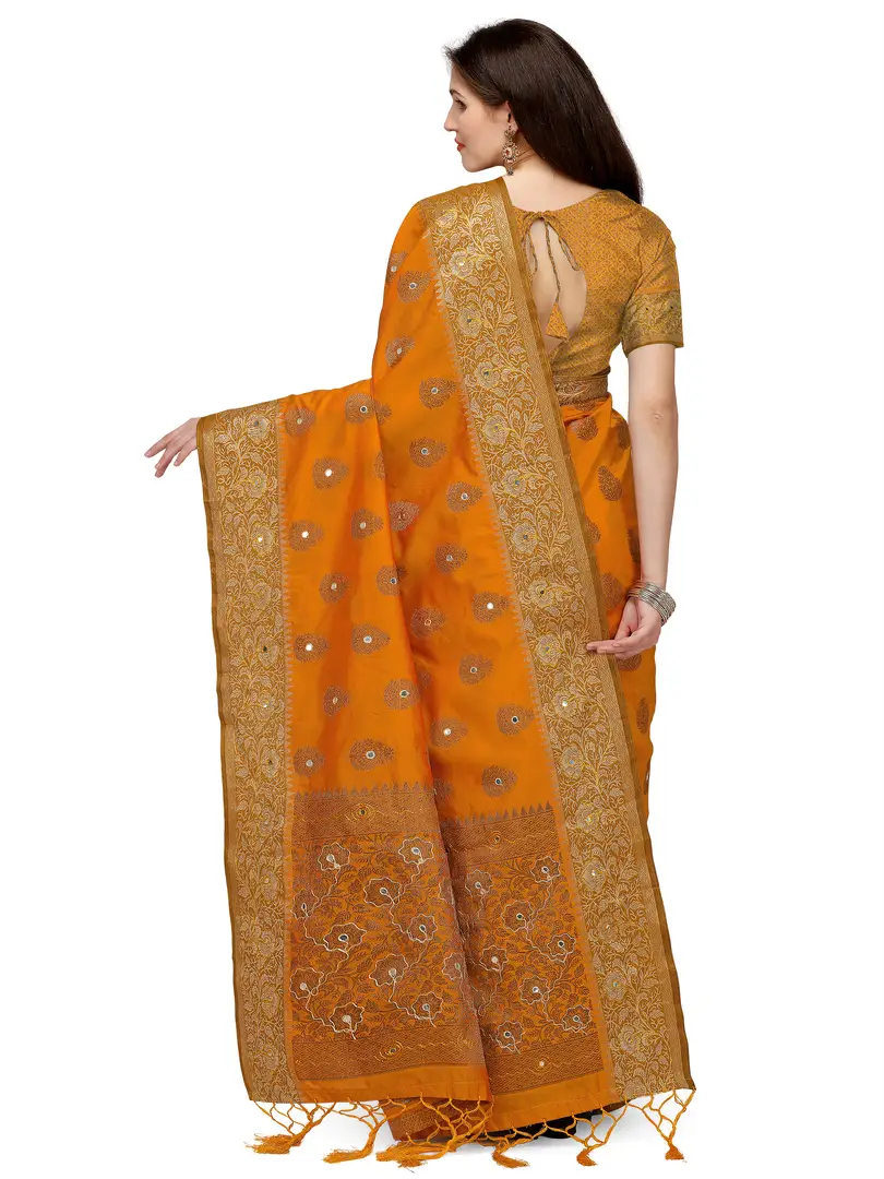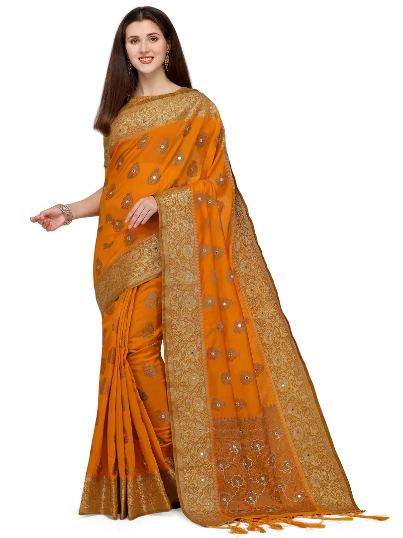 Party Wear Saffron Colour Banarasi Silk Mirror Work Festival Saree