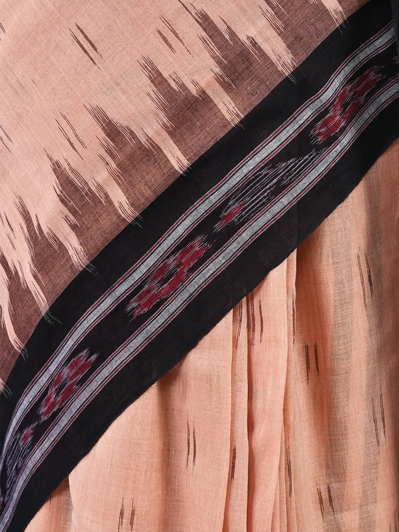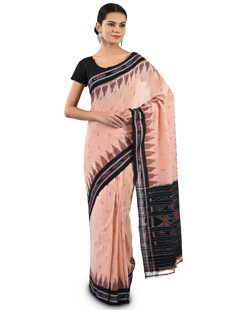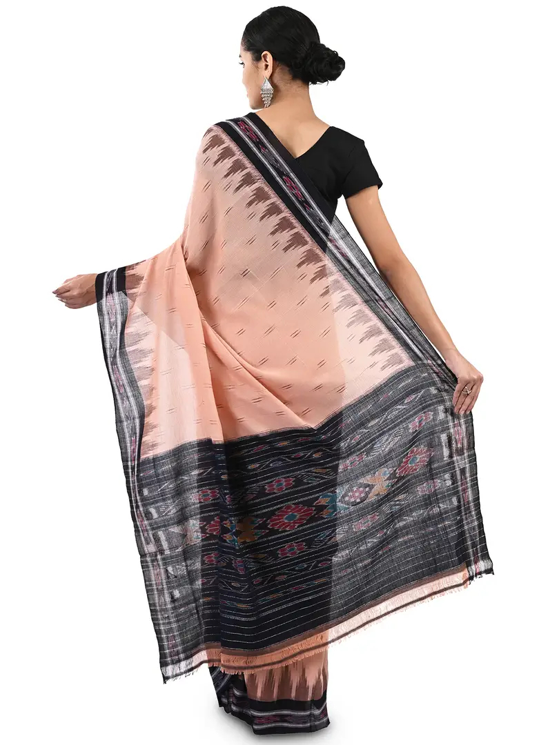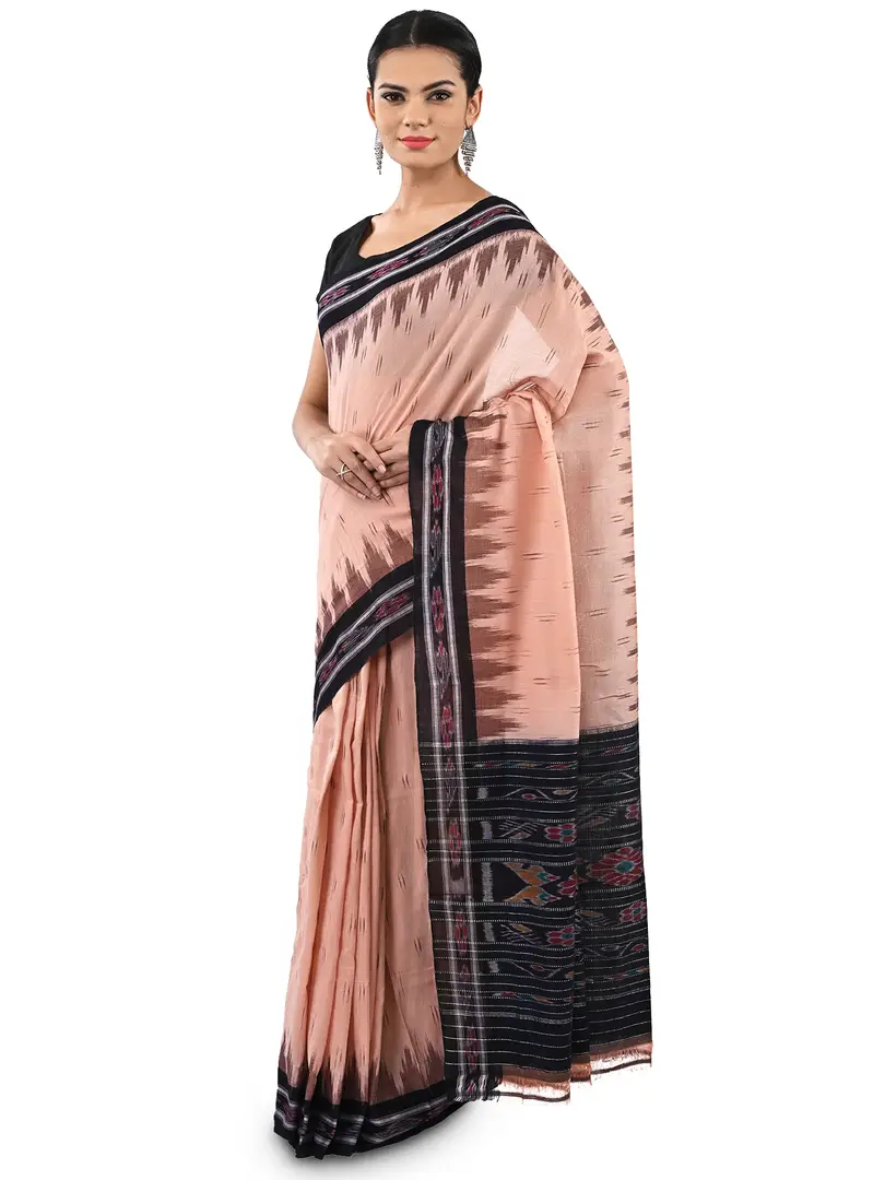 Presenting this elegant and classy sari exclusively from Craftnirmit. Made from luxurious fine cotton, the sari is woven within the traditional Ikat Orissa weavers by hand that give the exotic look to saree. And this saree comes with geometric Pattern. It is furthered designed with a contrast striped Pallu and temple border that give the vibrant and classic traditional look.\nFeel stunning styles in this traditional ikat saree from Craftnirmit. This saree you can be paired with an elegant pair of heels and minimalistic silver gold jewelry for your next family event or office.
