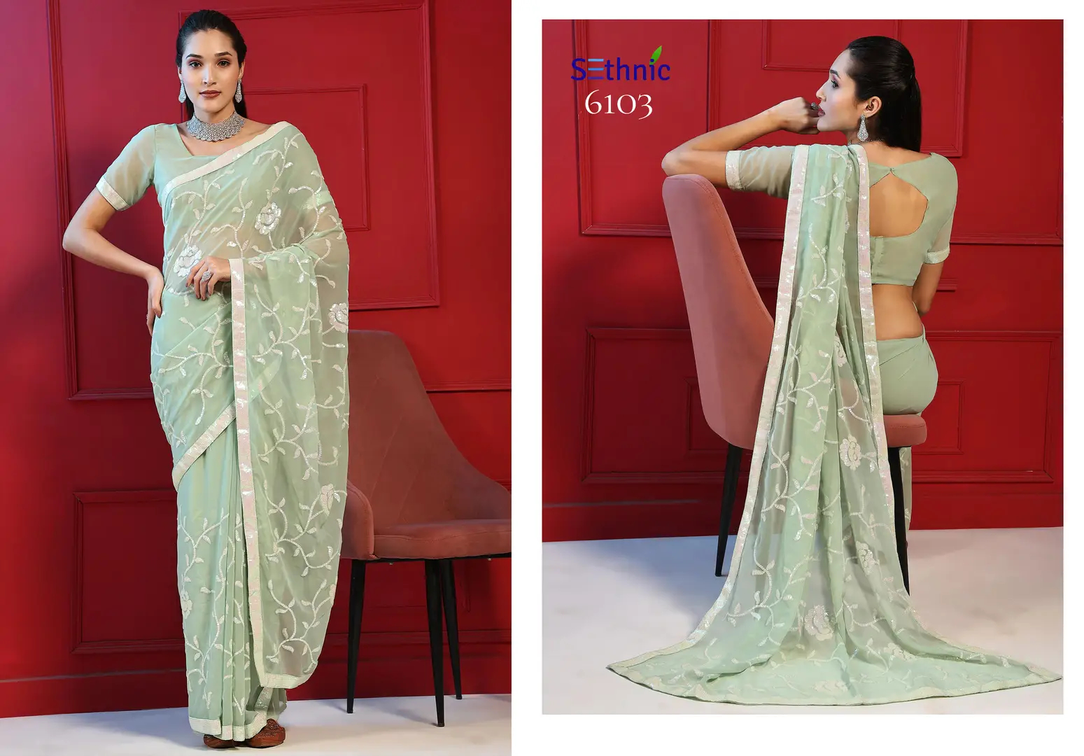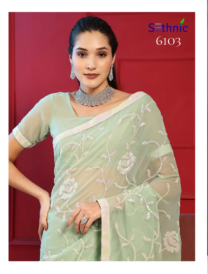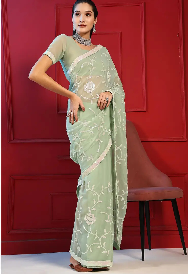 Saree Exotica Women Georgette Overall 3mm tone to tone sequins work with double run stitching for log durability. Pista Color Saree | Saree|Designer Saree|Saree for women|Sarees