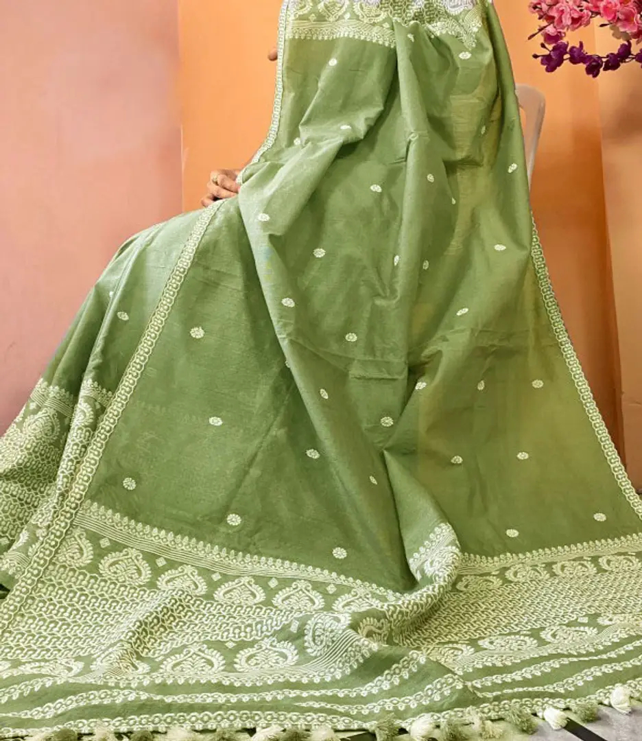 Slub Cotton Mekhela Sador Saree (Mehendi)