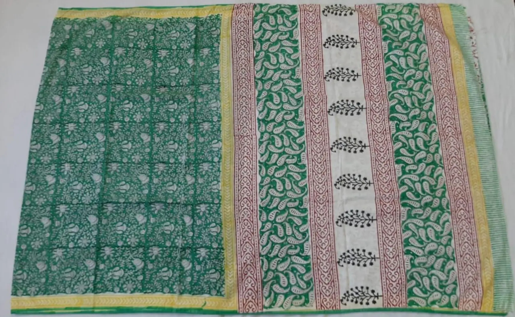 Kalamkari Block Print Linen Handloom Woven Saree With Zari Border.