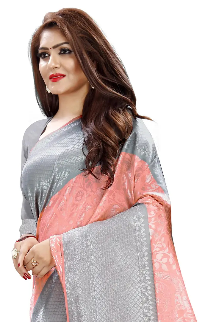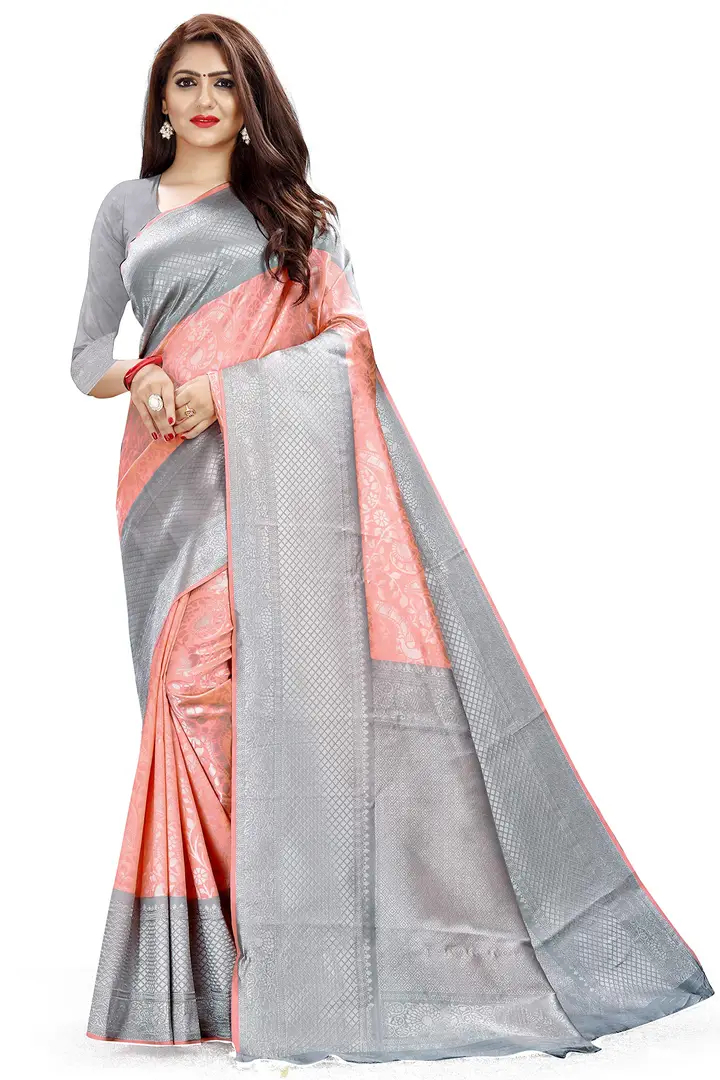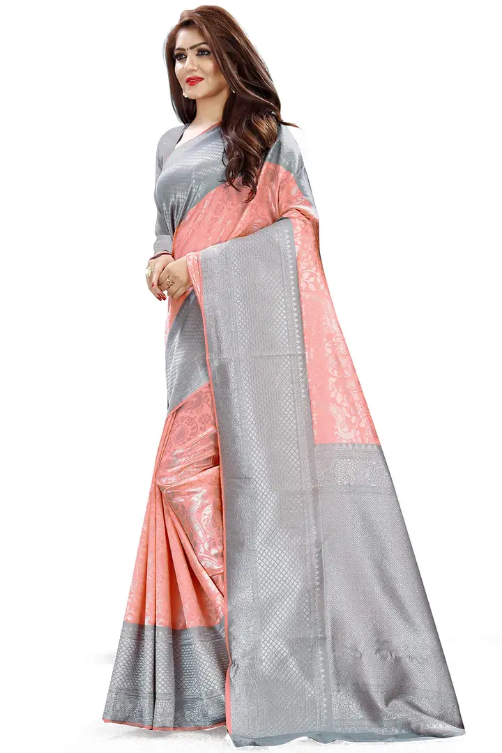 Kanjeevaram Silk Saree Traditional Women's Wedding Piece Bollywood Designer Grey Peach