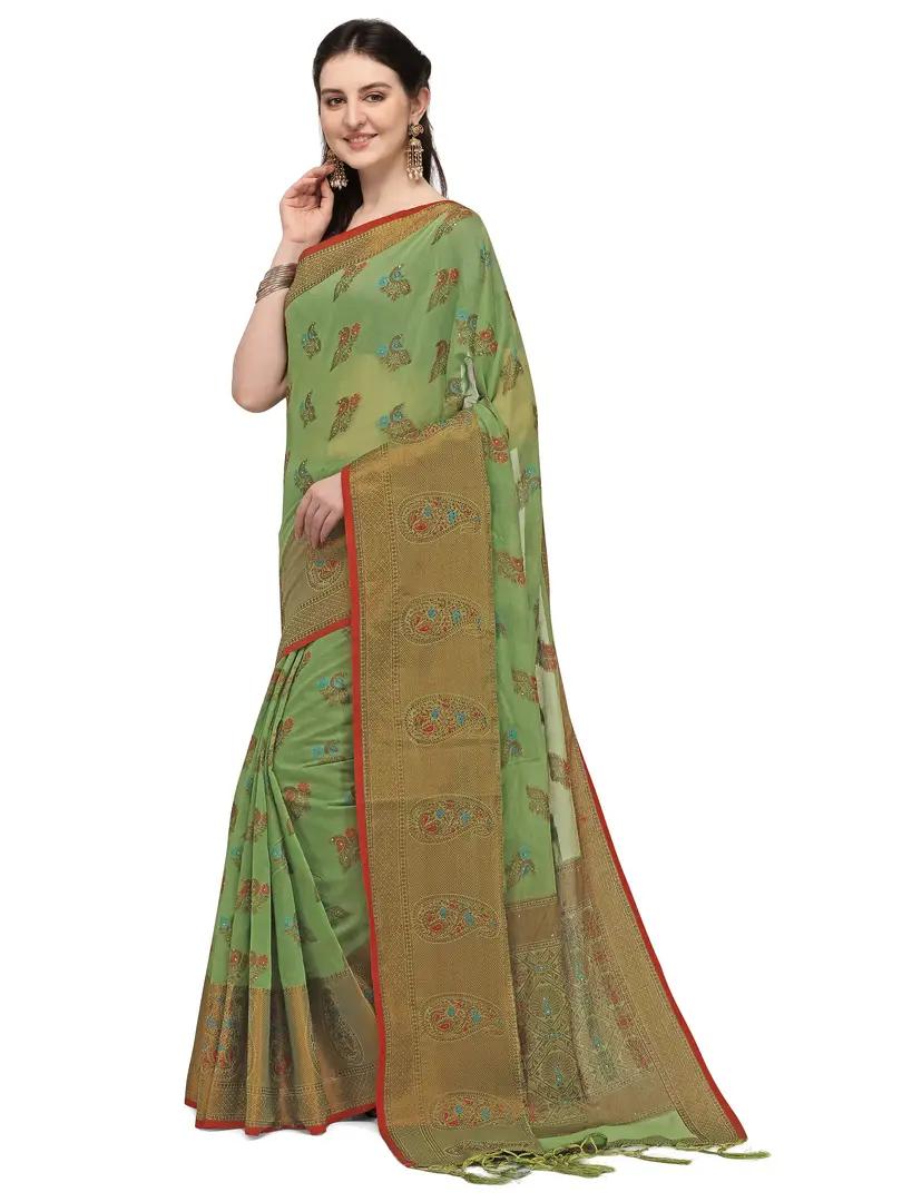 Party Wear Pista Colour Banarasi Silk Madhubani Work Festival Saree