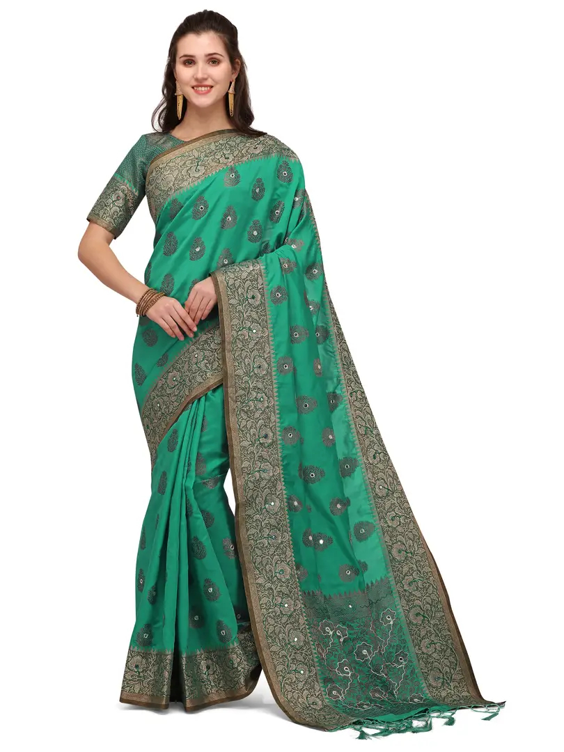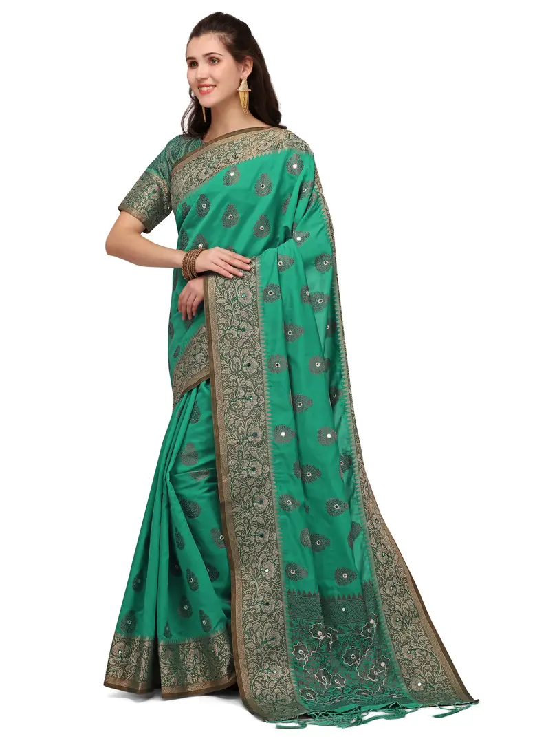 Party Wear Turquoise Colour Banarasi Silk Mirror Work Festival Saree