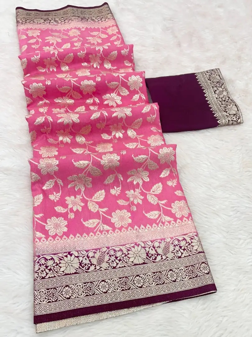 Partywear Banarasi Dola Silk Zari Work Saree With Blouse Piece