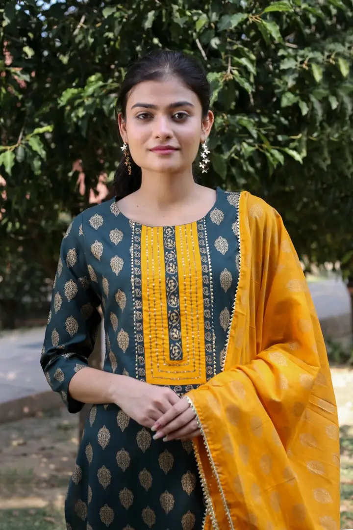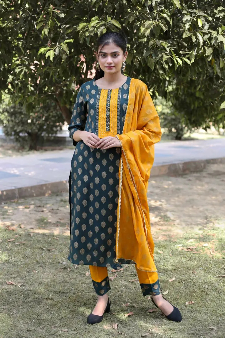 Stylish Olive Printed Rayon Kurta Pant Set With Dupatta For Women