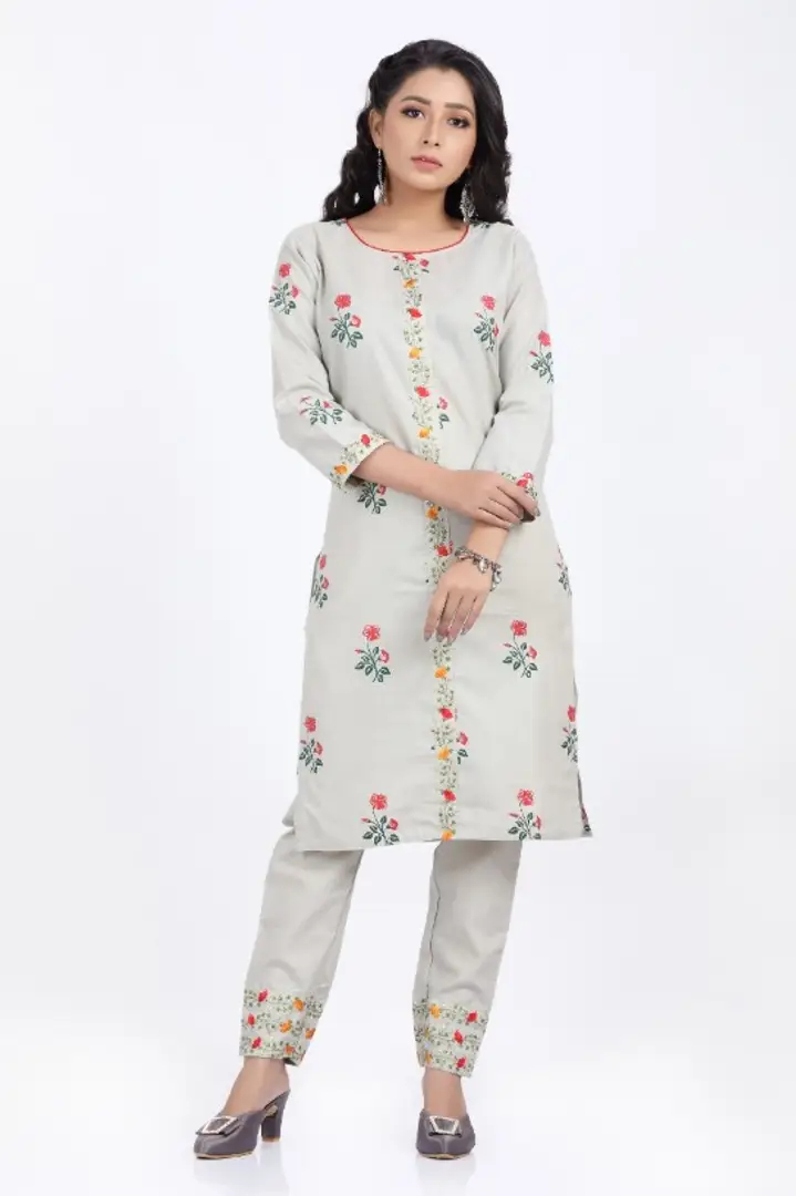 Cotton Embroidered With Floral Printed Straight Kurta With Pant Set