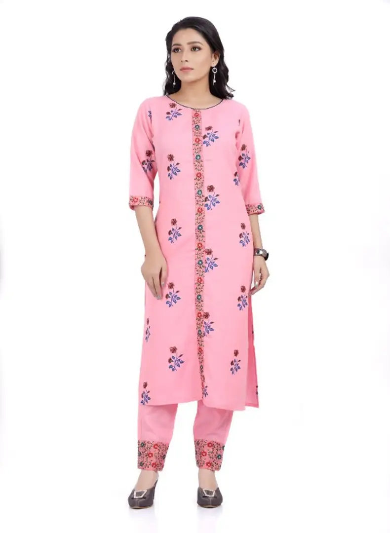 Cotton Embroidered With Floral Printed Straight Kurta With Pant Set