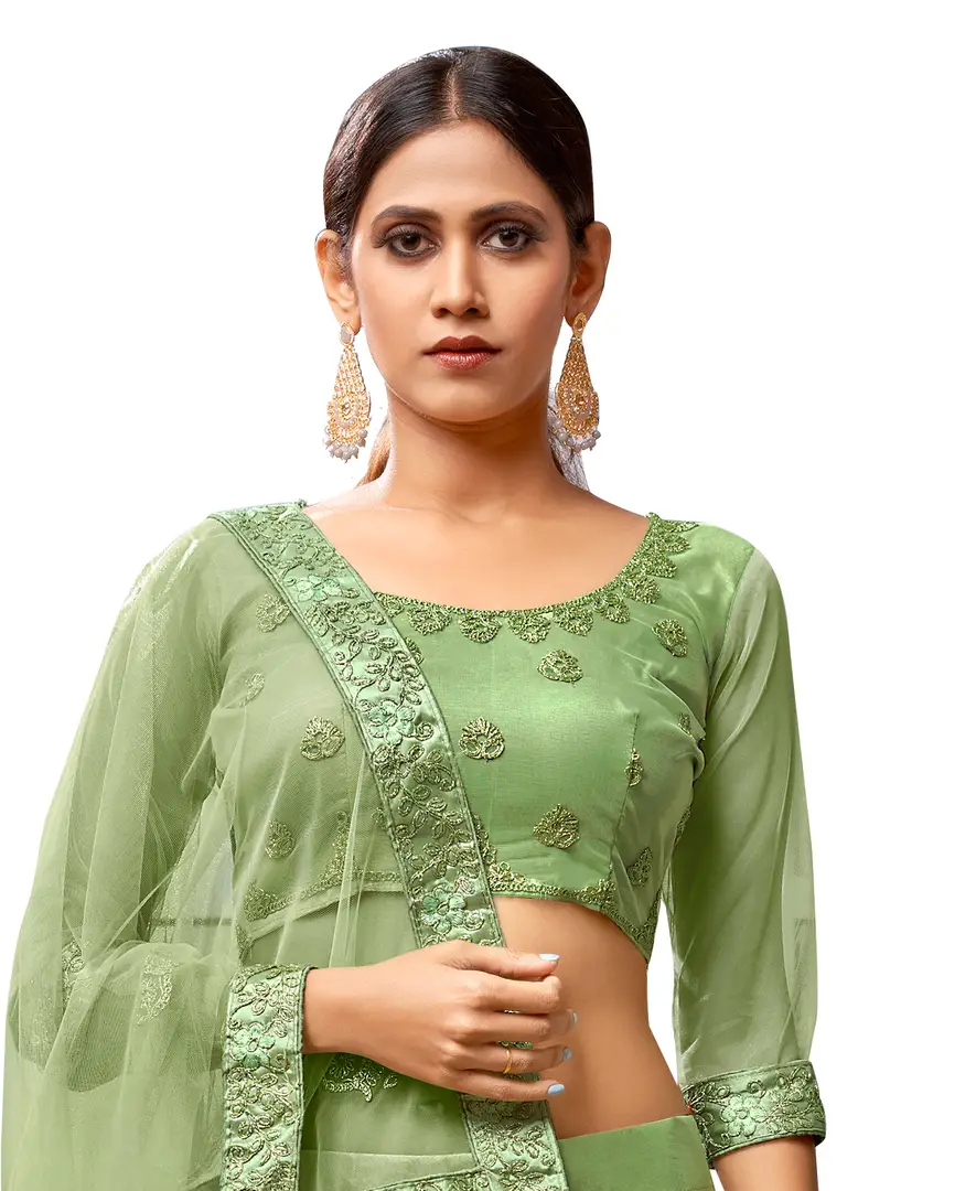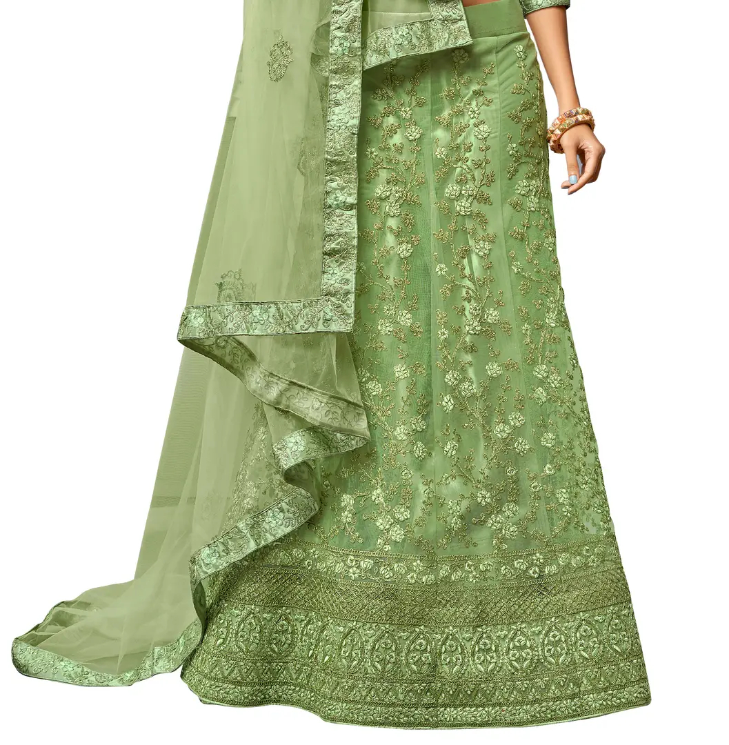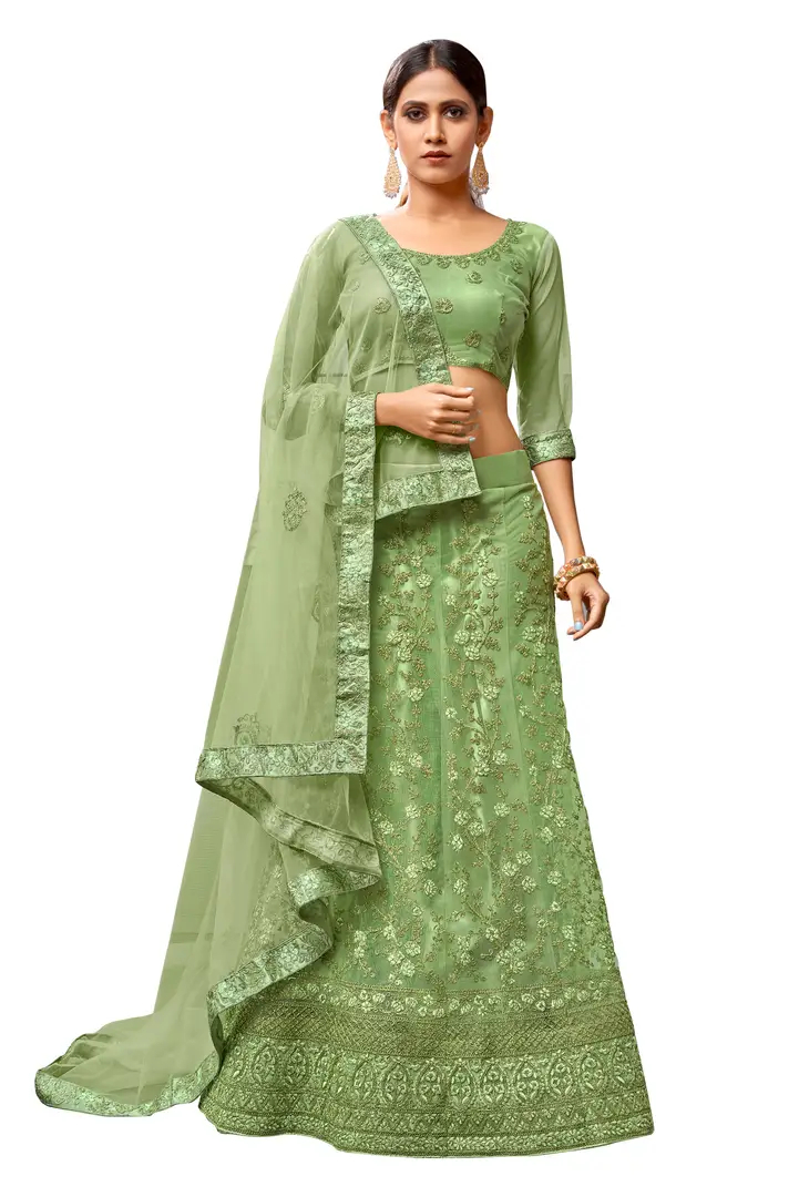 Elegant Light Green Net Embroidered Lehenga Choli With Dupatta Set For Women