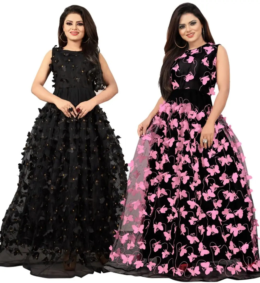Self Design, Embellished Satin Blend, Net Semi Stitched Anarkali Combo (Pack Of 2) Gown