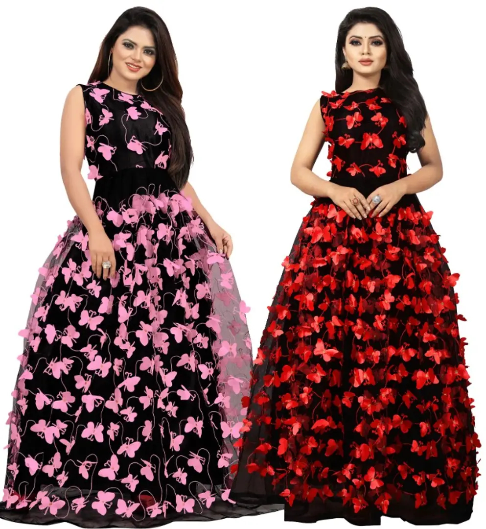 Self Design, Embellished Satin Blend, Net Semi Stitched Anarkali Combo (Pack Of 2) Gown