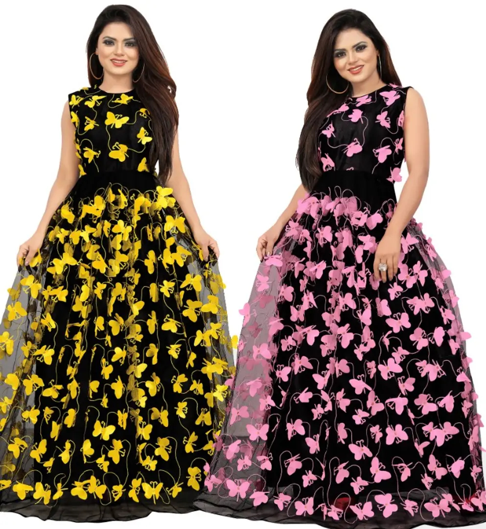 Self Design, Embellished Satin Blend, Net Semi Stitched Anarkali Combo (Pack Of 2) Gown
